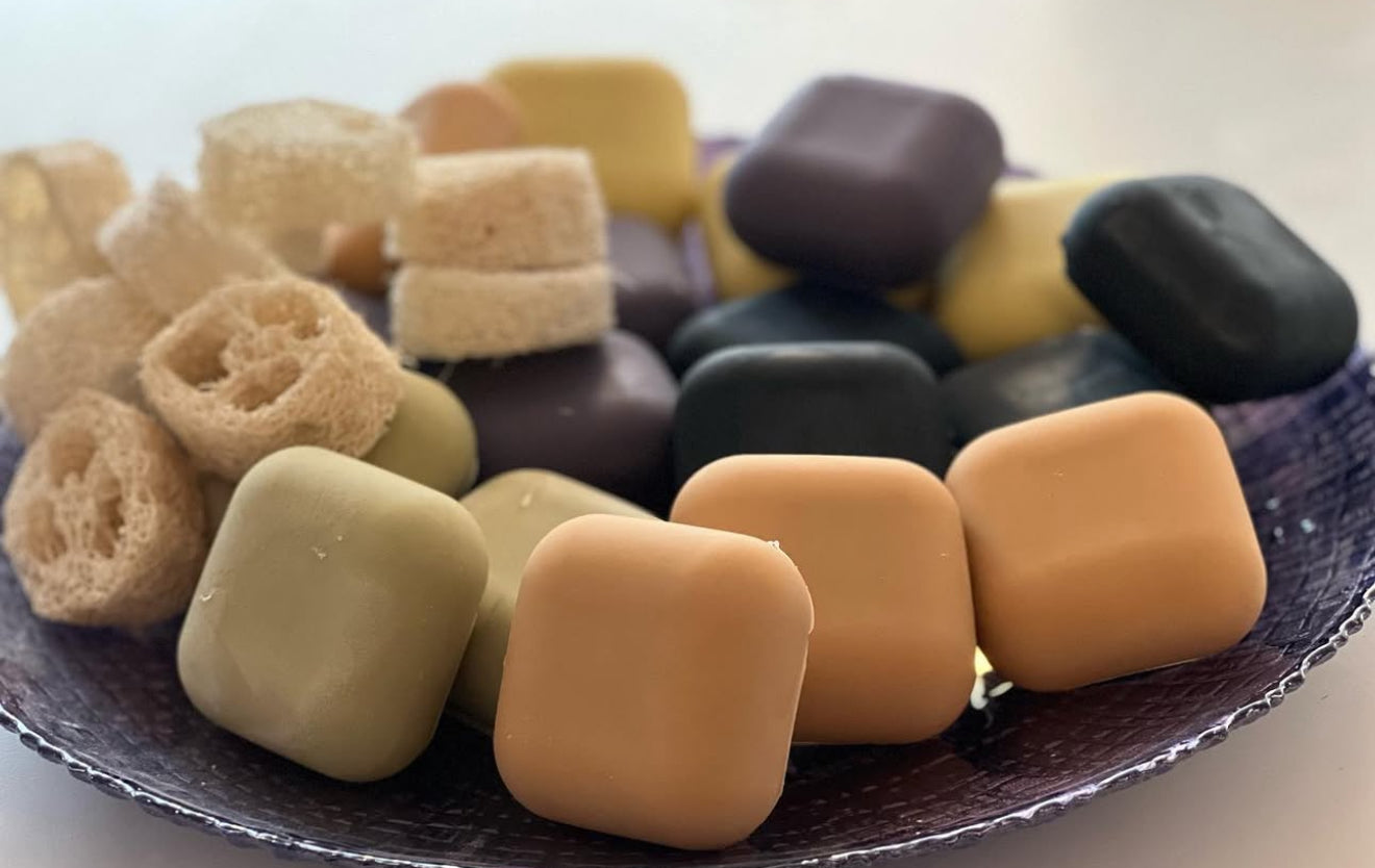 INCI: Sodium olivate, sodium cocoate, sodium castorate, sodium shea butterate, aqua, glycerin, montmorillonite (cosmetic grade green clay), cymbopogon citratus leaf oil, citral*, geraniol*, linanool*, limonene*, eugenol*